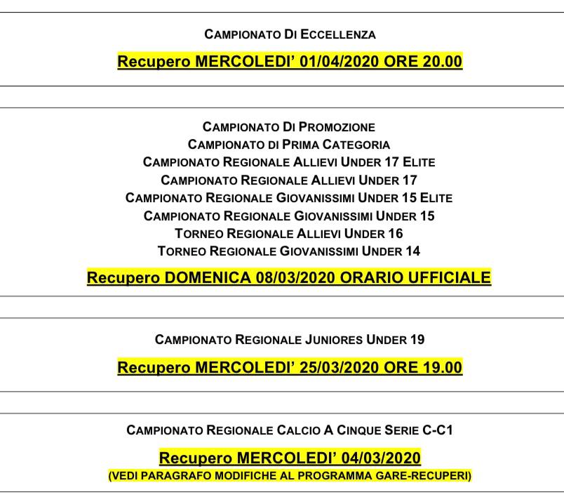 Come anticipato ieri il fine settimana appena trascorso che ha visto il rinvio di tutte le gare dei vari campionati regionali verrà recuperato domenica 8 marzo 2020, ad esclusione degli Juniores Under 19 che saranno chiamati a giocare quel turno mercoledì 25 marzo 2020 alle ore 19.00.