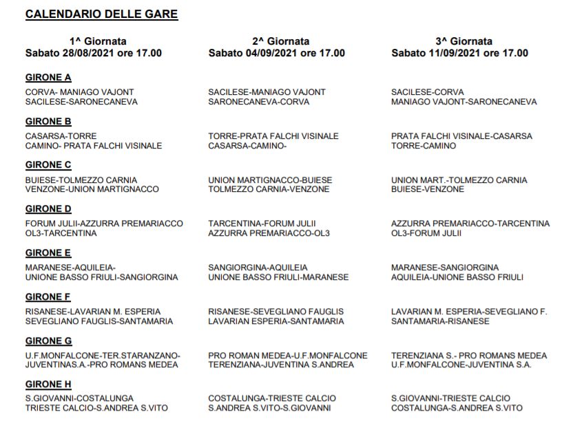 Prima gara sabato 28 agosto alle ore 17.00 sul terreno di gioco di Buja, poi incontro casalingo contro il Venzone sabato 4 settembre alle 17.00 al “Fratelli Ermano”, quindi sabato 11 settembre si chiude a Martignacco, sempre alle 17.00.