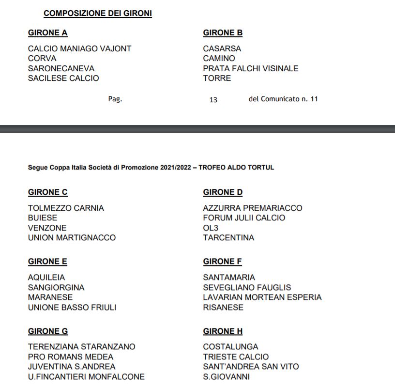 Ufficializzati anche i gironi di Coppa Italia di Promozione Fvg, con il Tolmezzo Carnia inserito nel girone “C” assieme a Bujese, Venzone e Union Martignacco.