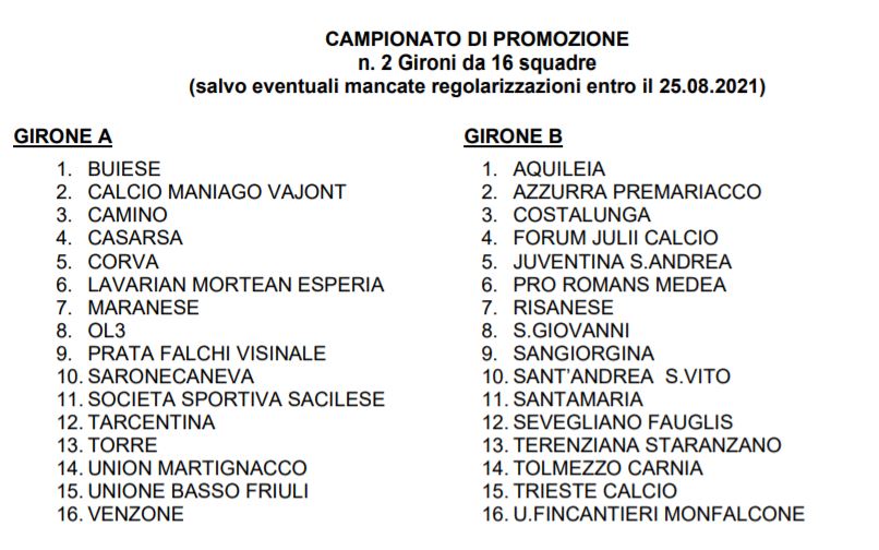 Sono stati ufficializzati oggi dalla LND-Figc Fvg i gironi del prossimo Campionato di Promozione Fvg. Il Tolmezzo Carnia è stato inserito nel girone “B” che comprende le formazioni isontine e giuliane, così come era accaduto nelle stagioni precedenti al 2019-2020.