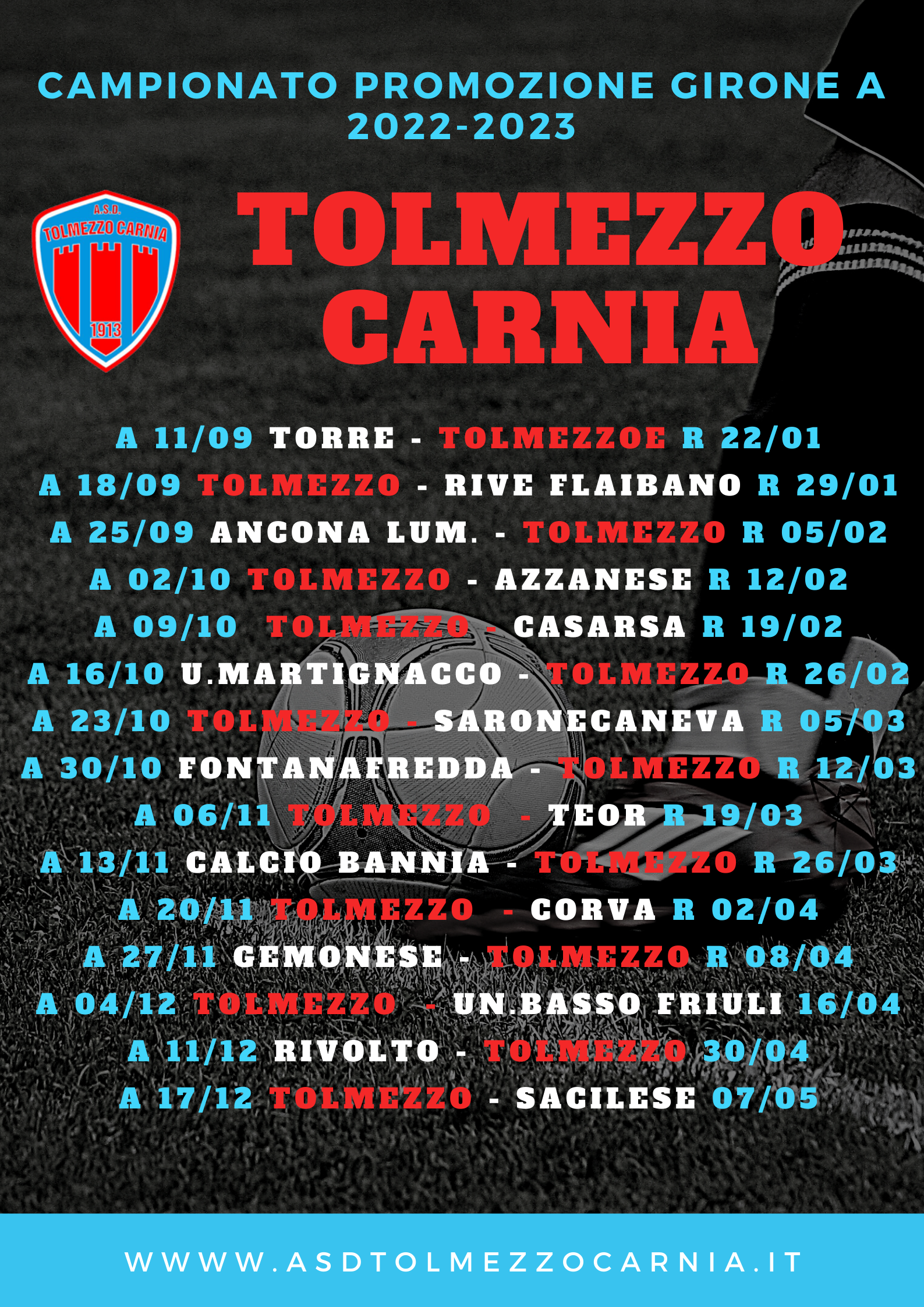 Sono stati resi noti ieri i calendari ufficiali dei Campionati dilettantistici del Friuli Venezia Giulia per la stagione 2022-2023. Il Tolmezzo Carnia, inserito nel girone A della Promozione (così come lo era stato due stagioni fa), debutterà in trasferta domenica 11 settembre a Torre di Pordenone alle ore 15.00.