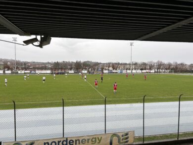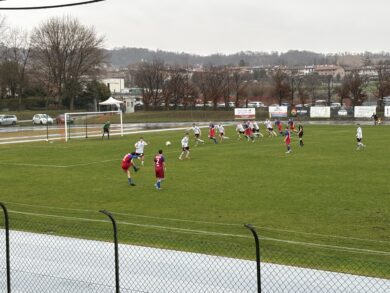 La squadra di mister Radina rischia dopo pochissimi secondi per un retropassaggio che provoca una punizione a due in area a favore dei rossoneri; la barriera respinge e poi la partita si incardina sui binari giusti. Bastano quattro minuti per sbloccare il risultato: Solari riceve al limite, si accentra e lascia partire un destro a giro che bacia il palo e si infila alle spalle di Nardoni. È l’1-0 che accende gli spalti e dà fiducia ai rossoneri. Il Pro Fagagna prova a reagire, ma è il Tolmezzo a mantenere il controllo del gioco. Al 6’ Cucchiaro, servito da De Blasi, chiama Nardoni a un grande intervento ad alzare sopra la traversa. I carnici spingono con convinzione, occupano bene gli spazi e al 22’ vanno vicini al raddoppio con Sicco, che sul secondo palo manca di un soffio l’appuntamento con il gol su invito di Motta. Il 2-0 è nell’aria e arriva prima della mezz’ora. Da calcio d’angolo scatta uno schema perfetto: De Blasi pesca Gabriele Faleschini che, con un mancino preciso sul palo lungo, supera ancora Nardoni e fa esplodere il pubblico rossoazzurro. Tolmezzo avanti di due reti e padrone del campo. La gara però resta viva. Al 36’ l’arbitro, su segnalazione dell’assistente, assegna un rigore al Pro Fagagna per un tocco di mano in area. Toffolini si presenta sul dischetto ma trova un attento Cristofoli che respinge la conclusione e difende il doppio vantaggio. È un momento chiave del match. Gli ospiti, però, non si arrendono e al 40’ accorciano le distanze: Clarini sfonda sulla fascia e mette in mezzo un pallone che Toffolini, questa volta, scarica con rabbia in rete per il 2-1. Si va al riposo con il Tolmezzo avanti ma con la partita ancora aperta.