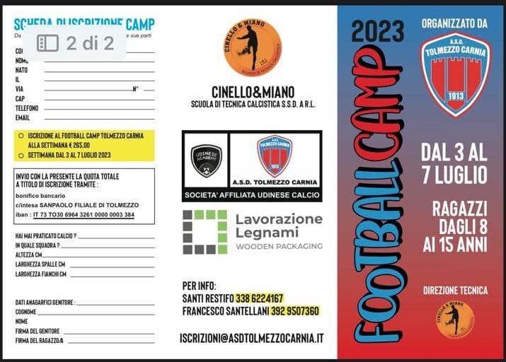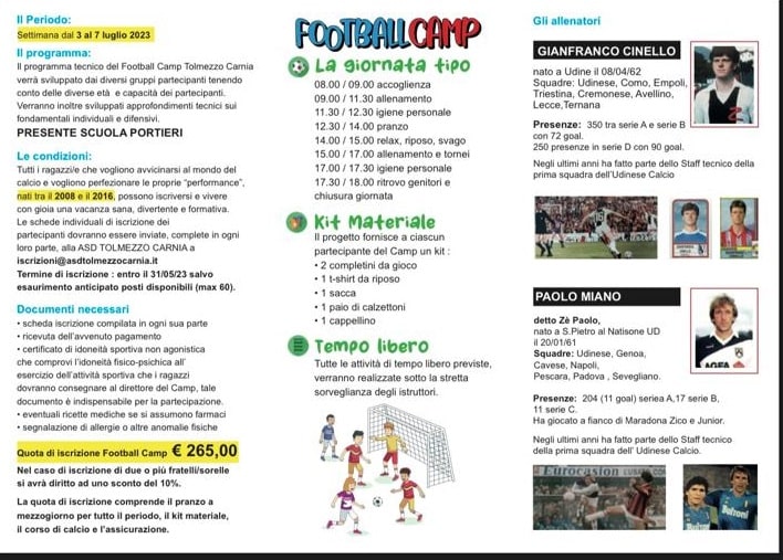 Definite le date per la nuova edizione 2023 del Tolmezzo Football Camp, la settimana estiva dedicata alle lezioni di tecnica calcistica individuale e applicata, proposta dai Maestri del Calcio, Gianfranco Cinello e Paolo Miano che attraverso la propria esperienza da calciatori e allenatori professionisti, sono pronti ad aiutare gli aspiranti calciatori nel sviluppare le rispettive qualità tecniche, così come era avvenuto nella prima edizione del 2019.